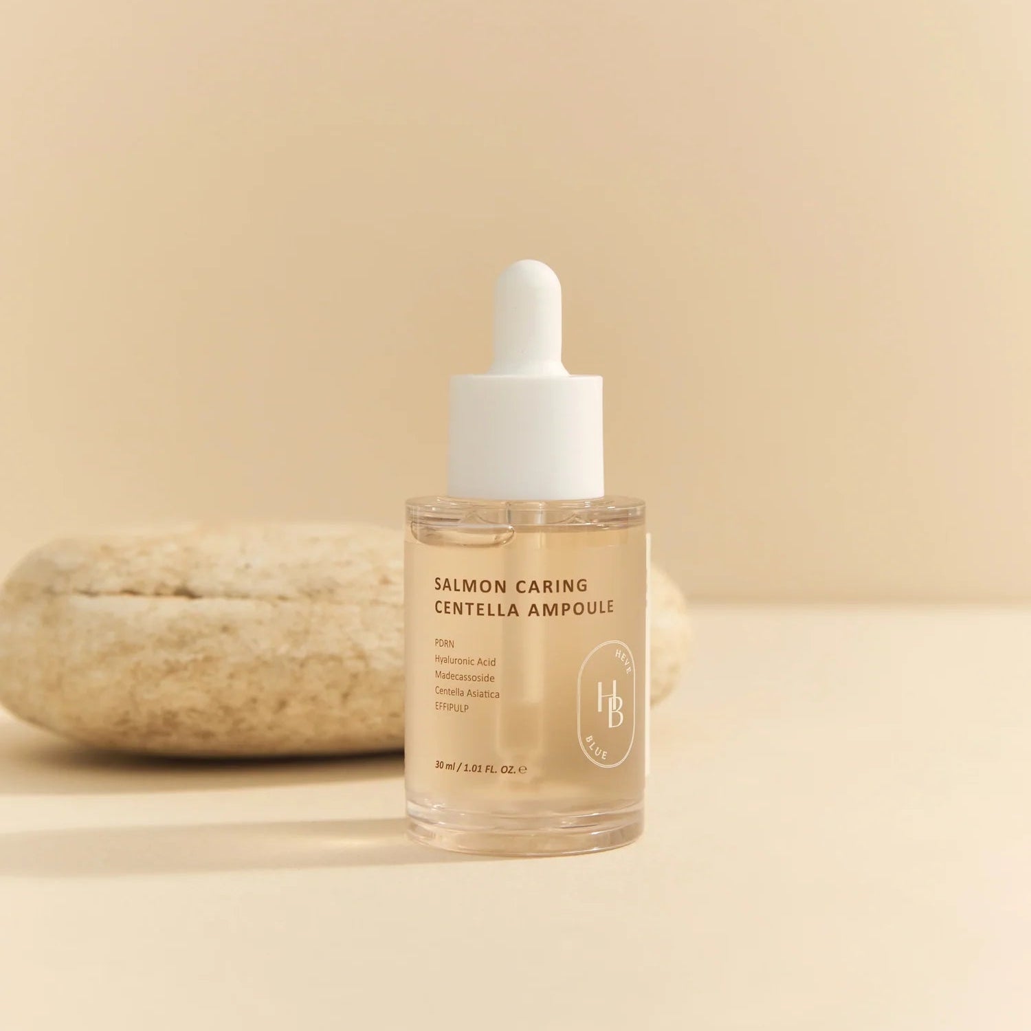 The Salmon Caring Centella Ampoule is a concentrated treatment designed to calm, nourish, and revitalize tired or sensitive skin. Featuring a potent blend of Centella Asiatica extract and Madecassoside, it soothes irritation and helps repair the skin barrier. Salmon Extract, rich in omega-3 fatty acids and proteins, boosts elasticity and skin regeneration, making the complexion appear firmer and more youthful. The ampoule also includes Niacinamide for brightening and Hyaluronic Acid for deep hydration. Its lightweight texture sinks in quickly, delivering powerful actives without heaviness — ideal for layering in both morning and evening routines.
